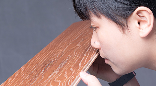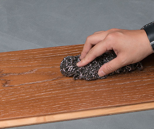 用鋼絲球對地板表面進行反復刮擦,地板表面無明顯刮擦痕跡、未產生木屑,板材耐刮擦表現十分優異。
