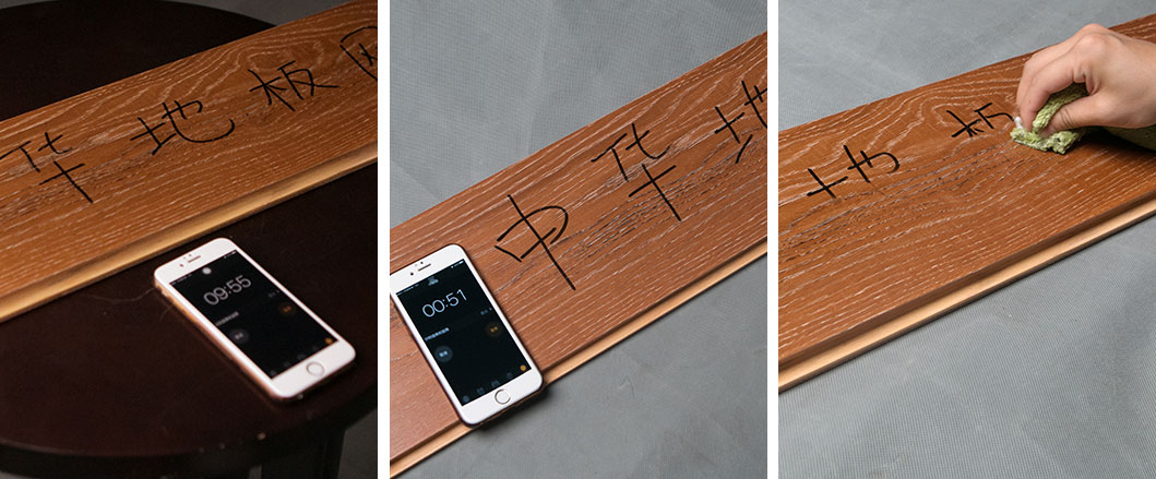 使用水性筆在地板表面寫下“中華地板網”字樣,靜置十分鐘后,用干抹布可以輕松擦拭掉,地板本身花色耐臟,且抗污能力強。