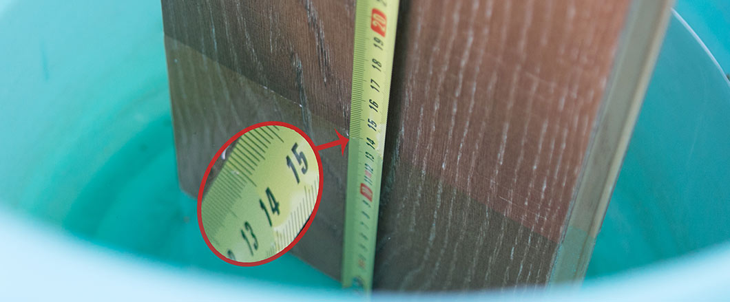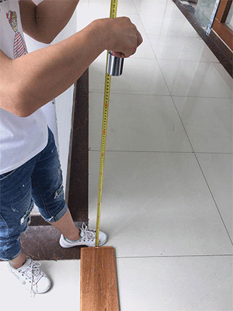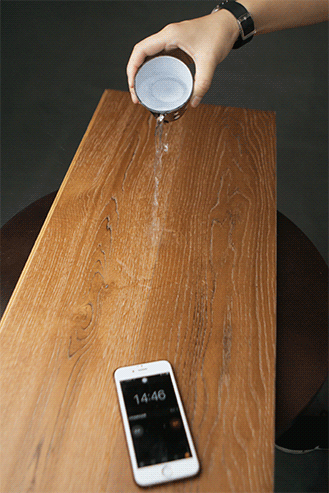 將儲有半杯水的杯子靜置于45°傾斜的地板上,檢測地板的防滑性能。水杯僅出現輕微滑動,這也歸功于圣達對地板表層的拉絲處理,有效增加了地板的防滑屬性。