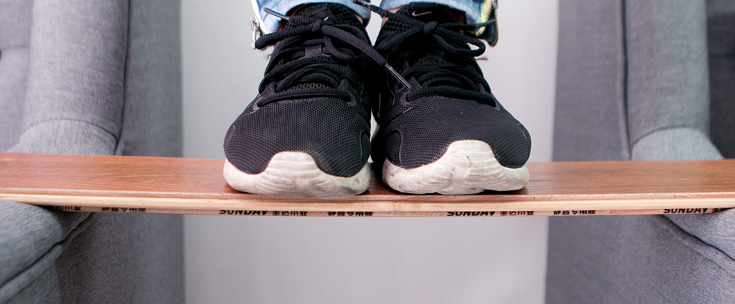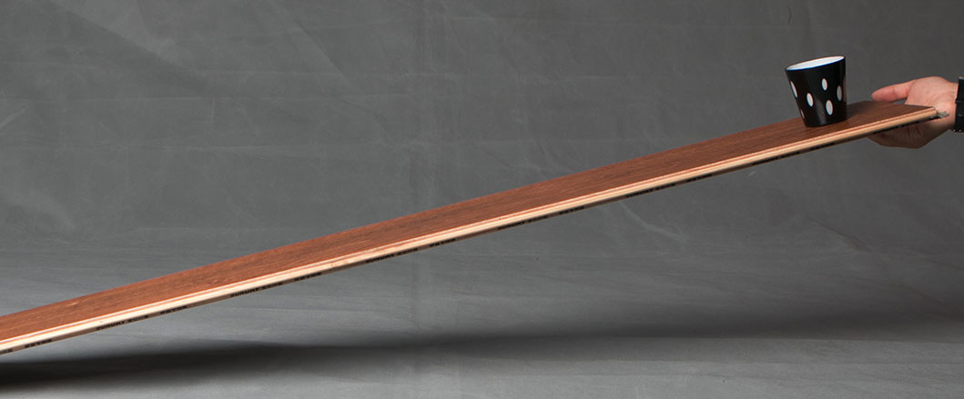將地板架于沙發之間,邀請體重為45kg的同事站立于地板。板材以站立點為中心,出現小弧度形變,承重能力一般。