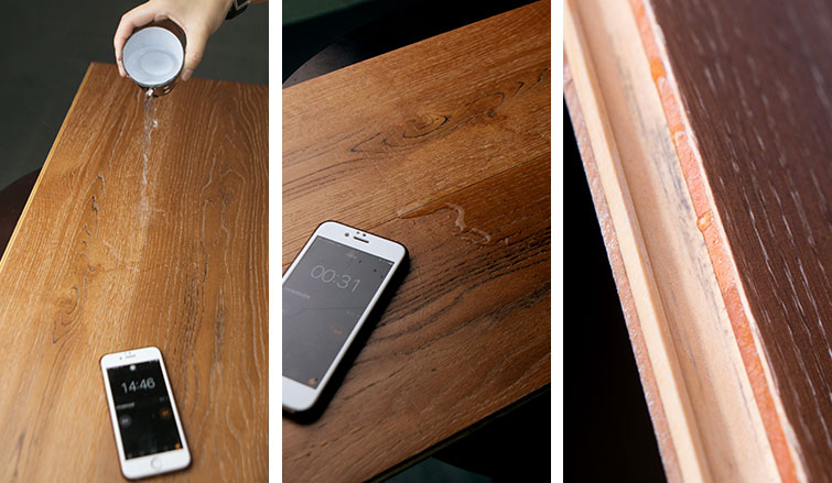 在兩塊地板結合處倒水靜置十五分鐘,觀察有無水滲。用抹布擦拭后,表層無水浸,板材結合處邊緣有少量水珠殘留,卡槽內部無水漬。緊密的鎖扣結構,將防水這件事變得輕而易舉。