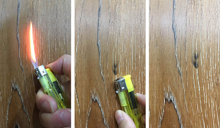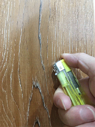 用打火機灼燒地板表面,測試地板的耐灼燒、耐高溫性能。灼燒后地板有黑色煙熏痕跡,經擦拭痕跡未消失,地板耐灼燒性能一般。