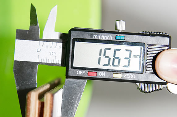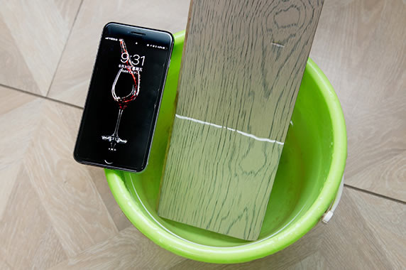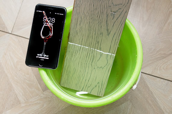 多層實木復合地板的穩定性一般都比較強。但為更直觀地了解這款新品的防潮性,我們對它進行了長達24小時的水泡“酷刑”。水泡之前,地板厚度為15mm,水泡之后,測量出的厚度約為15.63mm,計算得出地板膨脹率約為4.2%,明顯低于國際的18%。