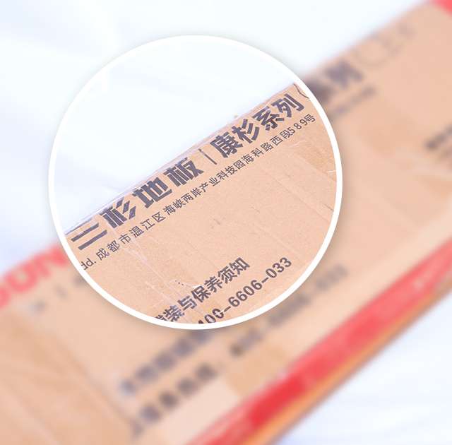 產品包裝:外包裝扎實厚重,可有效防止物流過程中因震蕩可能帶來的地板損傷,外包裝“三杉”品牌元素顯眼,鋪裝要求簡明扼要。